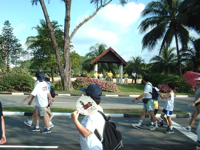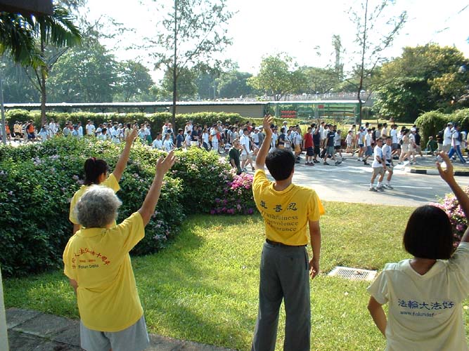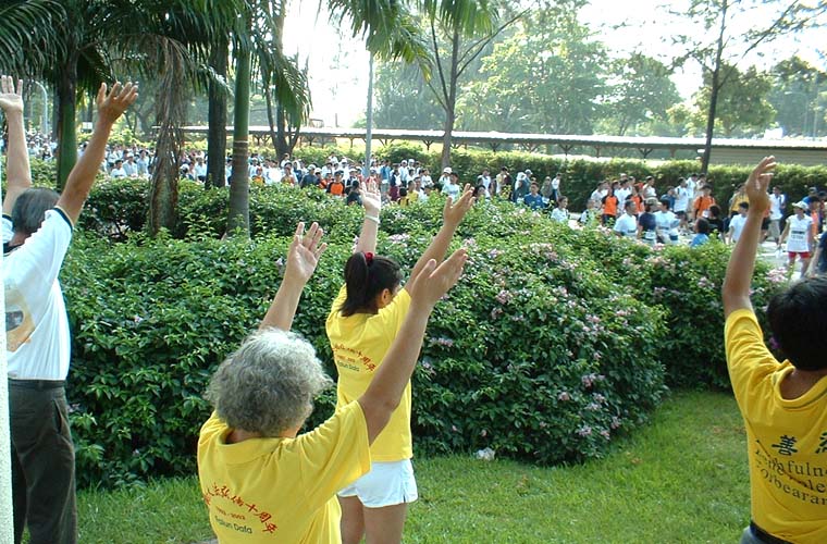 步行队伍在宽阔的马路上绵延数公里,在如此众多的人群中,几十名大法学员身处其中,影响面实在是极为有限,为了让更多的人能正面地了解大法,十多名学员离开了步行队伍,在队伍必经的一个路边小公园,静静地炼起功来,在炼功的同时,也有学员不断地在发着正念。这一举动看似简单,却取得了意想不到的好效果,在大法的感召下,几乎所有参加步行的人,无论男、女、老、少,都纷纷扭头观看学员们炼功,有惊喜的、有惊奇的、有惊愕的,有驻足停步的、有缓步流连的、有模仿比划的、有窃窃私语的、有善意微笑的、也有不以为然的、当然还有个别出言不逊的。整个过程,人流不断,就象是被检阅的队伍经过主席台一样,几乎人人都向学员们炼功的地方注目,时间长达3个多小时,几万人亲眼得见法轮功的风采,在心里留下深刻的印象。如此奇妙的洪法效果,实在是可遇不可求,众多的生命可能因此而有希望得救了。学员们都深深地感受到了大法的威力和师父的洪大慈悲。