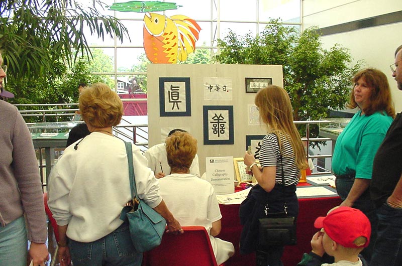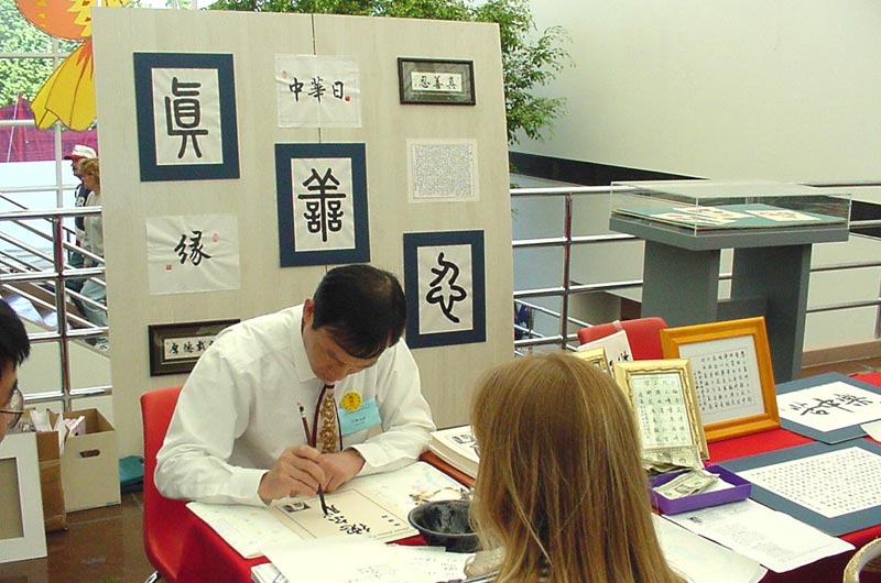 大会主席不时到书法展位来帮忙,有时也挥笔写字,一位美国人请他解释一块匾额上“真善忍”的意思,他认真地解释:“做人要讲真话,与人为善,遇事要宽容”,另几位社团负责人也过来坐坐,对我们的展位皆有好评。