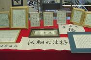 从纽约来的大法弟子带来已经写好和镶好各式镜框的风格各异的墨笔书法和钢笔书法。《蜀道难》、《春江花月夜》,“圆融”、“一片冰心在玉壶”、“厚德载福”,和更多录写的师父的《论语》和《修内而安外》等。