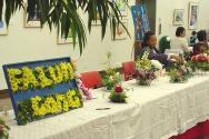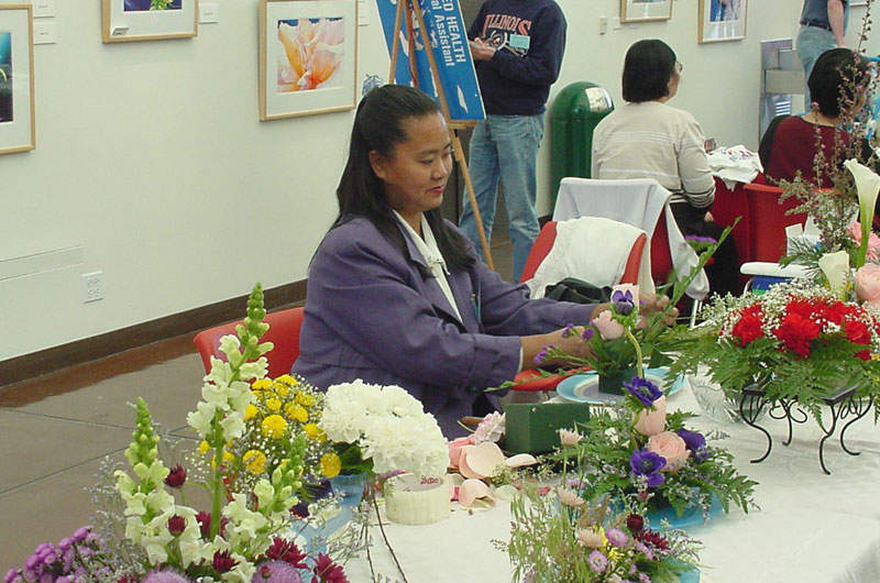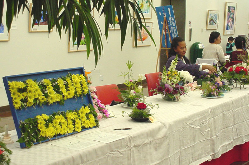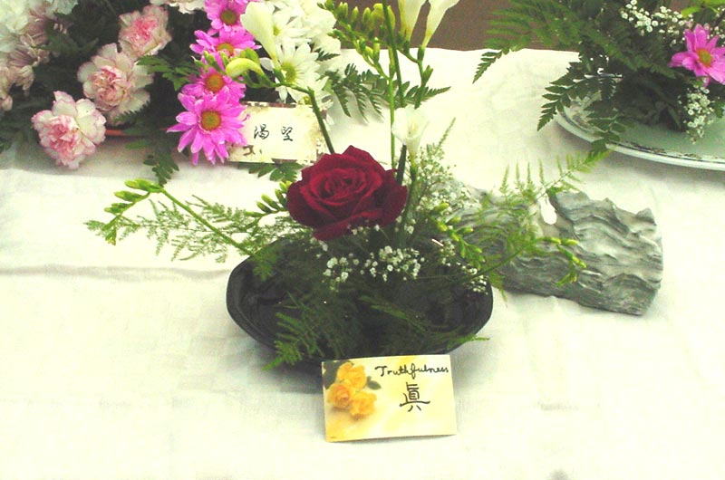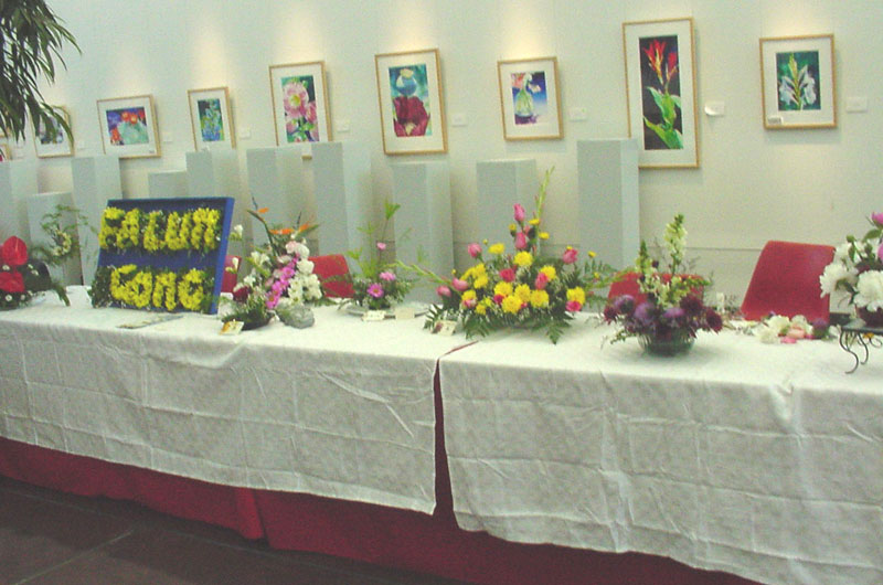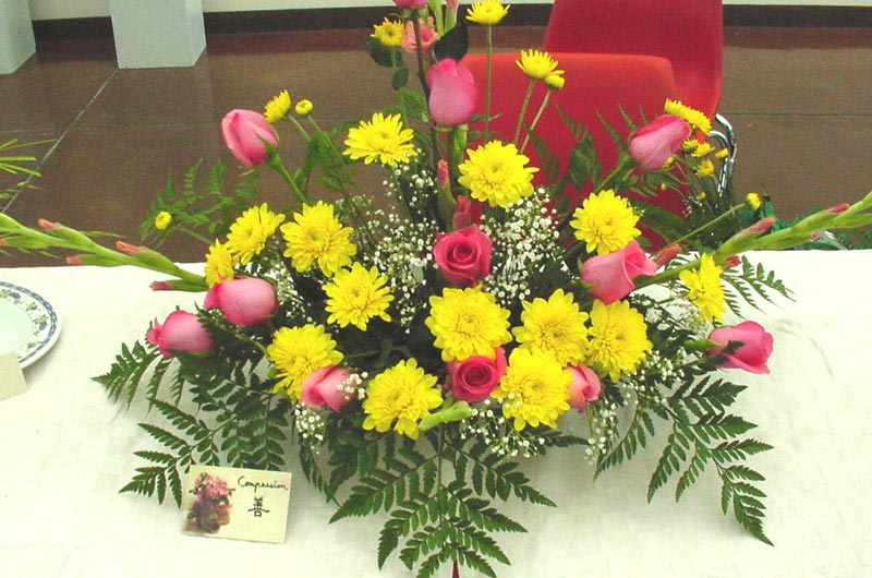 “戏台为法摆”,真正感到了大法的威力和神奇,第二天一早,十点开幕,大家七点多第一个到场,大会主席来后,同意我们的摆法,并把插花又加了个桌子,三张桌子摆在另一面墙正中!不一会“真善忍”立在大厅入口处正中,当插花展位摆满了美丽别致的插花后,一块立起来的展板,上面由绿底黄花摆出的“Falun Gong”又摆了出来!放眼望去,大展厅都是法轮功和“真善忍”!
