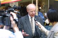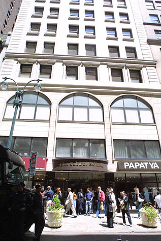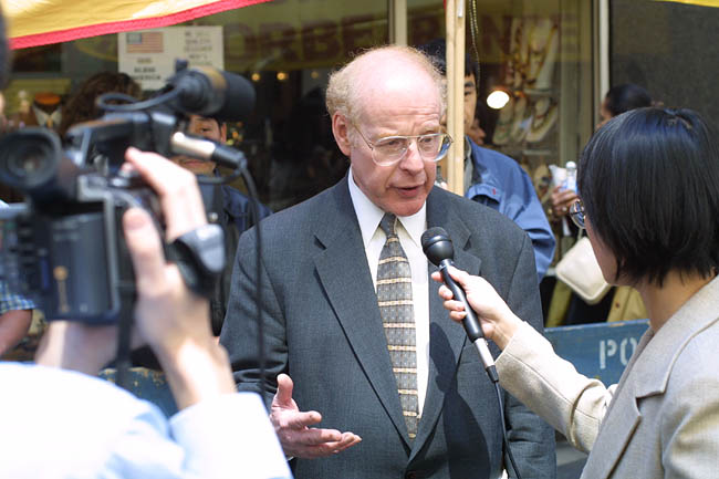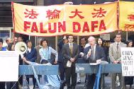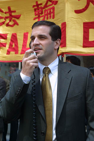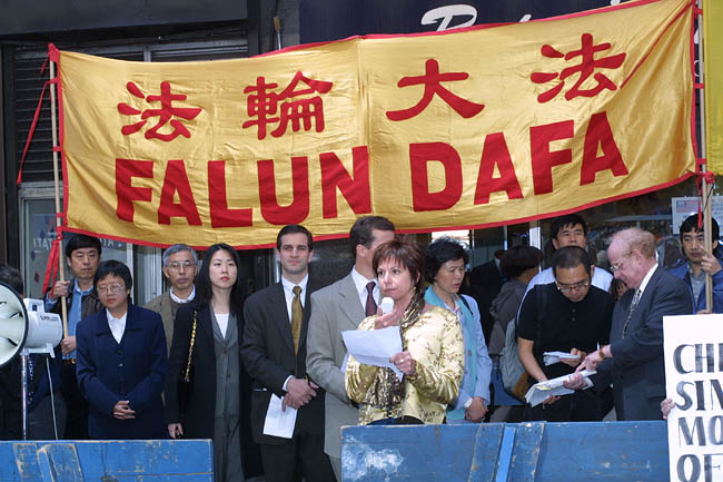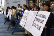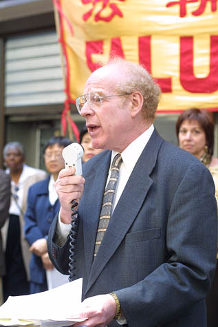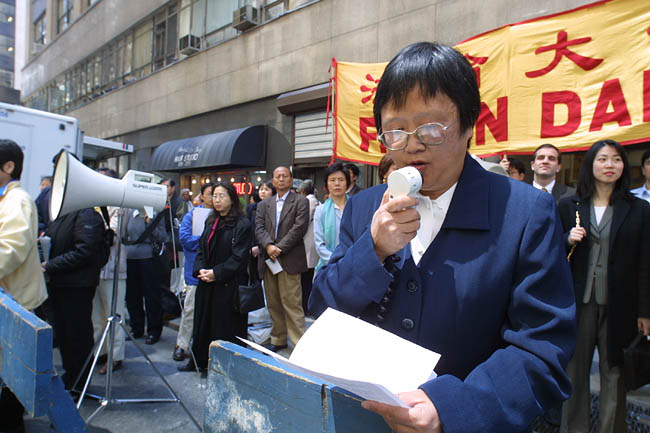 原告和律师谢尔登-雷福勒(Sheldon Leffler)22日在纽约曼哈顿中城《侨报》办公室门前公布案件的细节,并提供对原告的采访。