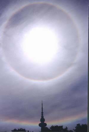 【明慧网2002年5月27日】2002年5月25日青岛《半岛都市报》报道:“5月24日上午10时左右,岛城上空突现一道瑰丽奇观:在太阳周围出现一个五彩的耀眼光环。记者从一高楼顶仰首望去,在灿烂的太阳周围,有一道内红外黄的奇特光环,在万里晴空下显得分外夺目。大约半个小时后,天空又出现了第二道绚丽光环,这个光环比紧围在太阳周围的第一道光环更加绚丽多彩。中午12时许,光环渐渐消失。”