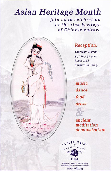 这次招待会是庆祝本月的“亚洲文化节”,同时感谢美国各界人士几年来对法轮功的不懈支持和帮助。在招待会期间,来自纽约的数位中西方女学员,身着中国古典的传统仕女服--唐装,向来宾们展现中国古老传统文化。学员们同时进行了五套法轮功功法的示范表演。