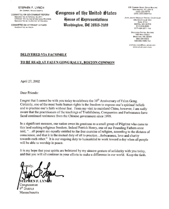 【明慧网2002年5月3日】以下为美国国会议员斯迪芬·林池2002年4月27日通过传真送达,并被宣读于波士顿绿地公园法轮功集会上的一封信: