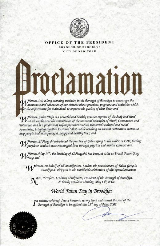 鉴于,当布鲁克林区法轮功学员与全世界一道共同庆祝这一特殊节日之际,我代表所有布鲁克林人,向他们致以敬意;