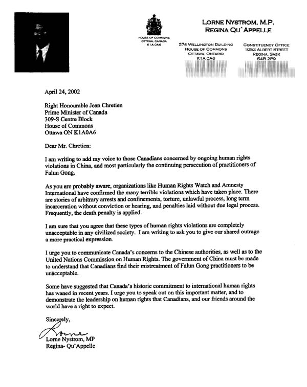 我敦请您向中国当局及联合国人权委员会表达加拿大对此事的关注。必须让中国政府明白,加拿大人认为中国(江泽民)政府对法轮功学员的虐待是不能令人接受的。