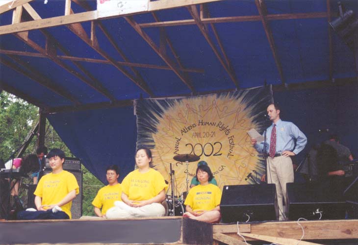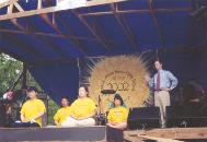 在仅离舞台20多米处就矗立着法轮大法的展位。从那儿发出的无限慈悲、祥和的宁静覆盖了整个街场。大法学员有的盘腿打坐,在做神通加持法;有的学员单手立掌发正念;有的学员在烈日下给熙熙攘攘的人群发真相资料,向人们介绍法轮功………那么多微笑的人们从大法学员手里接过真相资料,非常认真地看着,有的大人已匆匆走过去,但抱在怀里的小孩却向我们张开了小手,当我们学员把珍贵的大法资料送上去时,每个人的脸上都绽开了最灿烂的笑容,还有许多人看到大法学员老远的就伸出手来,我们明白,是慈悲伟大的师父把这些善良的有缘人引导给我们的,为了让更多的有缘人得到救度。