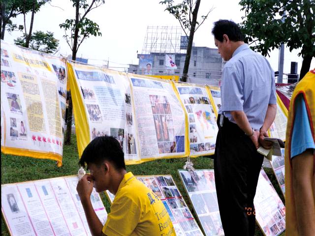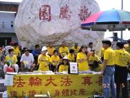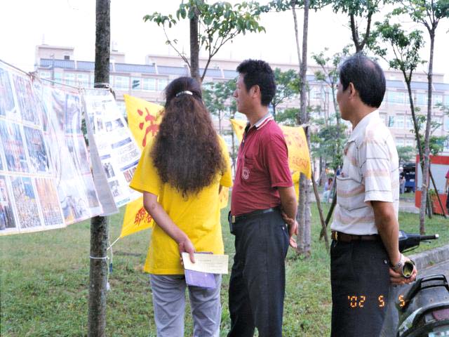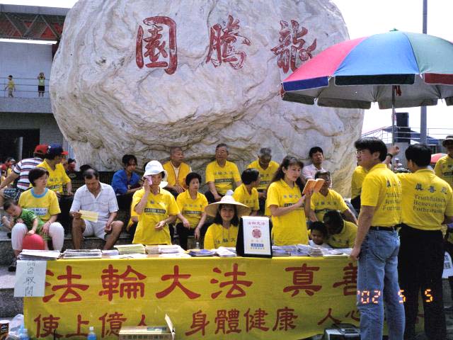 龙潭地区的本地法轮功学员约五十人也利用这个难得的机会洪法,学员七点多就到运动公园来选个好位置设摊、摊位就设在入口处的正面,这个位置虽然会晒到太阳,但民众一入场老远就可以看到,洪法效果非常好。除了设摊位之外,学员也准备了数十张大型的真相图片,摆满了入口处,供民众阅览,使民众能在短时间内对法轮功有更深入的了解。