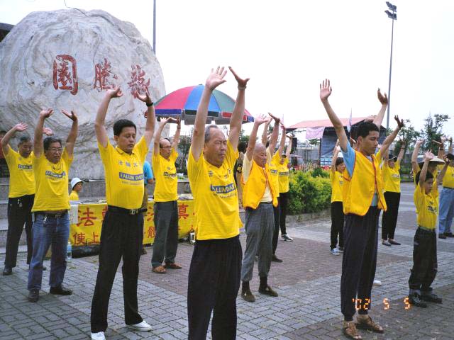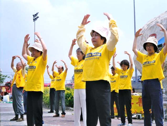 活动的开幕典礼虽然定在上午九时,但是八点起就有许多民众及各界人士、学生到场,因此主办单位八点半就邀请法轮功学员上台表演五套功法,学员除了表演功法外,还配上清楚的说明,从功理的解说、真善忍的自我要求谈起,到大陆的无理迫害与及法轮功在海外的洪传,民众看得津津有味。