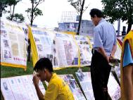 也有的人看完展板后还是不理解大法,而且说难怪中共会镇压法轮功,你看那些图片聚集那么多人,中共当然会怕。学员听到后便告诉他,图片上在大陆的功法展示,都是大陆官方单位主动邀请法轮功去表演的,而且法轮功以前在大陆也是很受鼓励的,后来因为领导人的私心,才动用国家机器去迫害法轮功。可是在此同时世界上其他国家政府却对法轮功褒奖不断,而法轮功的学员都是好人,难道说其他国家都错了只有中共对吗?这可能吗?此人听完后无话可说,连忙说道镇压好人确实是错的。