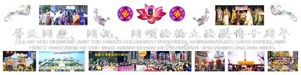 上图:洪法展版:普天同庆法轮大法洪传十周年听啊!这是来自遥远宇宙之外的呼唤, 亿万万年前,师尊带着普度众生的一念 从无到有 一步步地向我们走来。走啊!超出一切生命想象的漫长, 历尽万难,师尊的慈悲 在不同的天体中召唤着我们的本性。 正法,一个闻所未闻的词在宇宙中回响, 永生不灭,那是所有生命的渴望 而这渴望只有在师尊的承受中才能成真。 结缘,只为我们心底还有原始的那一份善念, 佛的弟子,那是愿意主动同化真善忍的幸运者 而师父所赐的荣耀弟子永远无以为报。 传法,至尊之主“用人相行于世,用人言示法理”, 风餐露宿,在肮脏的尘世间呼吸着业力 一双巨手十年间捞起了多少沉沦无望的生命。 魔难,整个宇宙巨大的业力压向三界, 立掌擎天,亘古往来众生的罪业一人担当 千难万险 谈笑间唯愿弟子早圆满。 护法,让众弟子在数年间建立洪大威德, 言传身教,无微不至牵引迷中求道人 大觉的智慧终使无数天体得新生。 十年,慈悲的师父说那不过是短短的一瞬, 万物之主,在宇宙的最底层包容一切生命的无知 哪怕只是一天也是众生永远都不敢面对的记忆。 十年,真的是太短太短的一瞬, 随主同行,那是亿万年也不会再有的殊荣 这十年的记忆又将是我们生命永远的喜悦。 十年,波澜壮阔的历程、惊心动魄的巨变, 大穹重组,尽在恩师挥手一念间。 十年,新旧更替的时刻、万物再生的机缘, 普天同庆,永颂我主佛恩浩无边! |