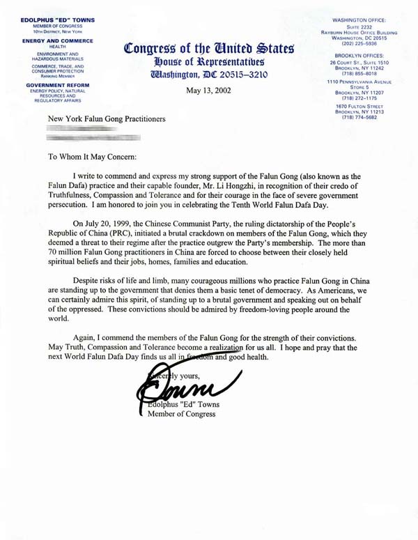 我写此信是为了嘉奖法轮功(也称法轮大法)及其有才能的创始人李洪志先生,表达我的有力支持,同时也赞赏法轮功的“真善忍”的法理以及法轮功修炼者们在[江泽民]政府的残酷迫害目前所展示出来的勇气。我很荣幸参加你们的法轮大法洪传世界十周年的庆祝活动。