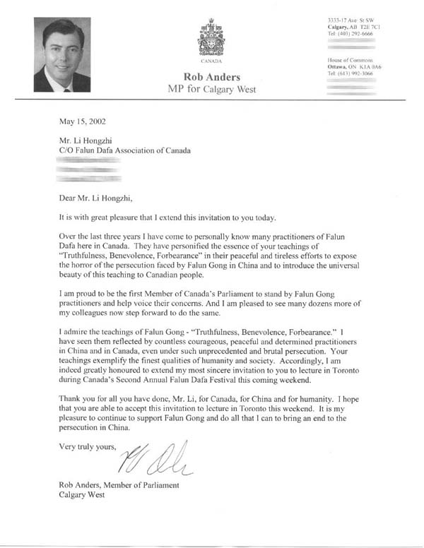 我敬仰法轮功“真善忍”的教导。我看到了即使在这样前所未有的残酷迫害中,“真善忍”的教导在无数勇敢的,和平和坚定的中国与加拿大法轮功学员身上展现出来。您的教导是人类社会最优秀品德的楷模。为此,我真是十分荣幸地向您发出我最诚挚的邀请,请您借本周末加拿大第二届法轮大法节之际莅临多伦多讲法。