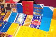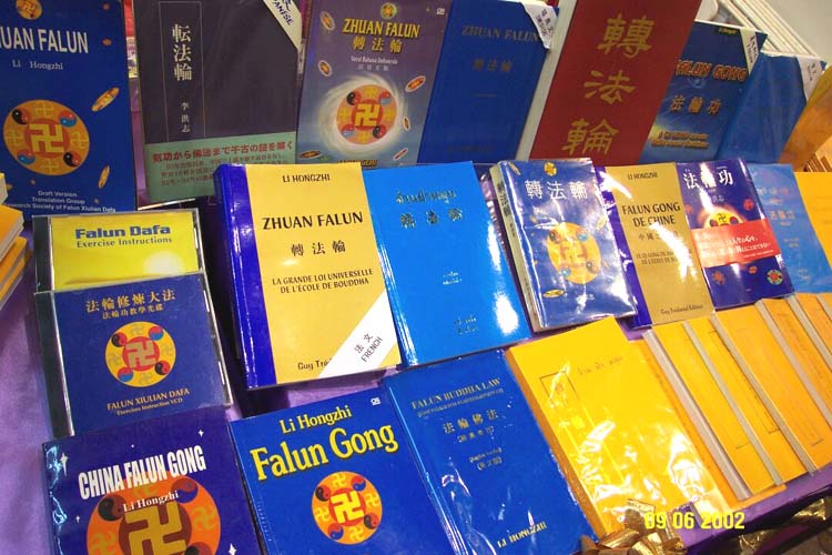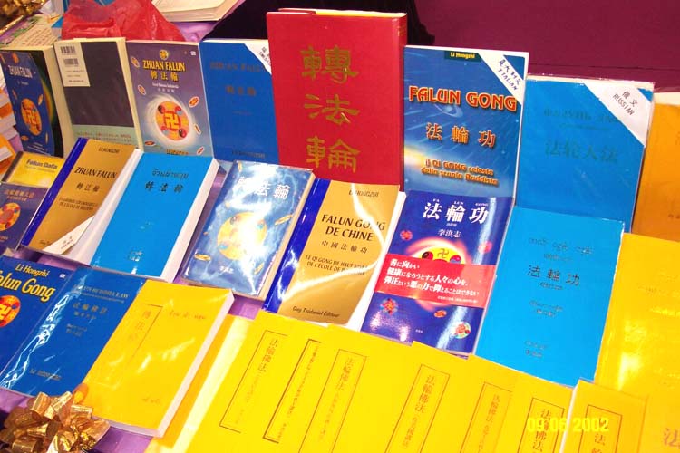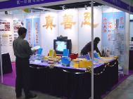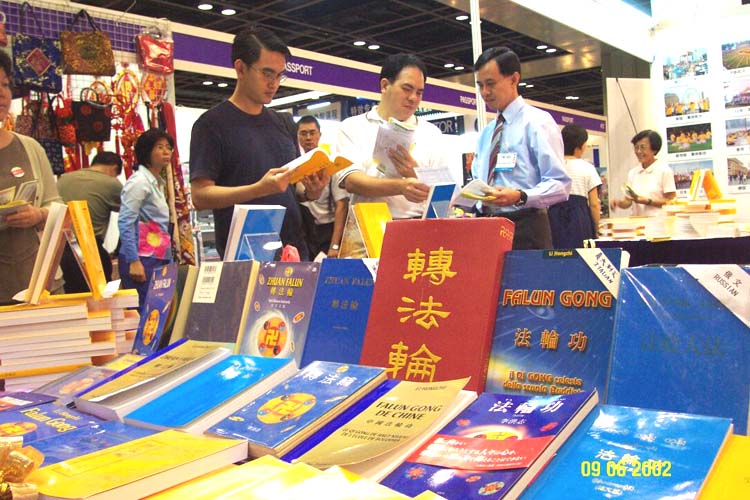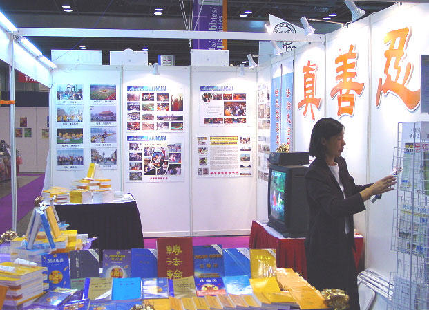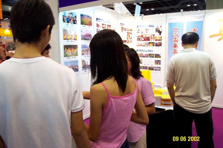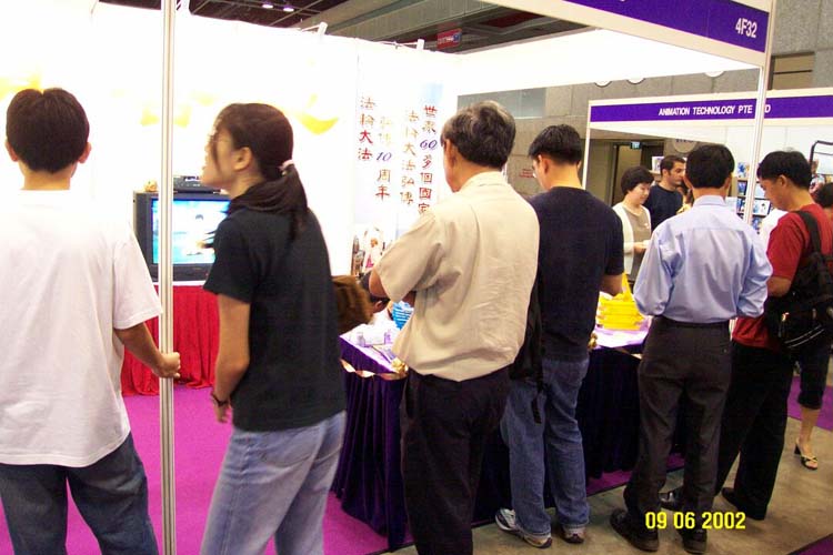 展台里,几位工作人员微笑着向过往顾客赠送大法书签和简介。随着几句简短的问候,真相也传了过去:“法轮功好。请来了解法轮功的真相。法轮功在新加坡是合法的。”过往的人们带着好奇和谢意接过了各种真相资料,也带走了一份份意义深长的祝福。走过这个展台的人们静静地看着展品,注视着电视中演示的祥和的功法。有的人与工作人员交谈,询问修炼法轮功的益处;有的人在资料架前流连忘返,自取了多种中英文材料回去与亲朋分享;有的人表示有意参加九天学法班,还有许多读者驻足台前,不停地翻看着大法著作,最后当场购买《转法轮》,《洪吟》或教功光盘等出版物。