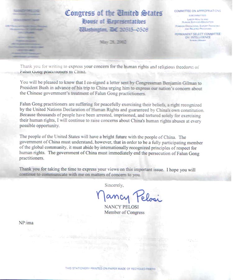 您将欣慰地知道,我联合签署了在布什总统前往中国访问之前由本杰明.格尔曼议员发起的信,强烈要求总统表达我们国家对中国(江氏)政府迫害法轮功学员的关注。