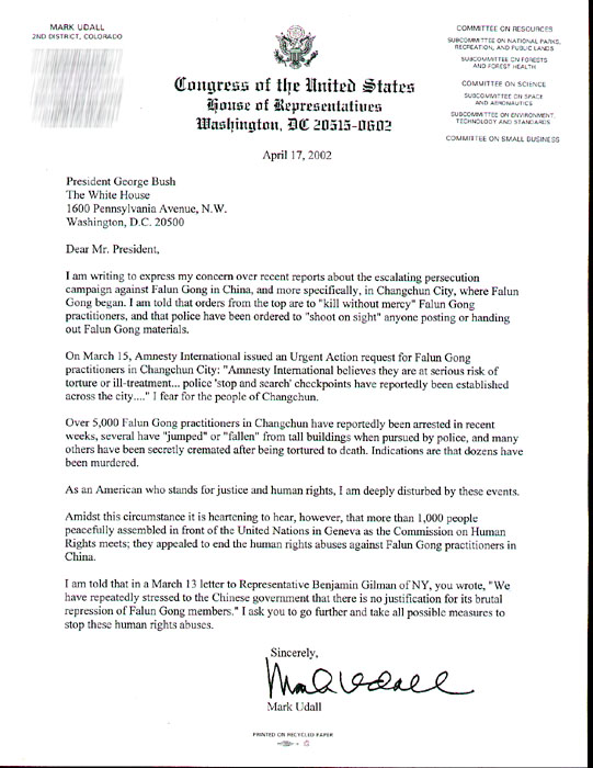 据悉,您在3月13日给众议员本杰明-吉尔曼(Benjamin Gilman)的信中说:“我们已经向中国[江氏]政府反复强调,对法轮功成员的野蛮镇压是毫无正当理由的。”我请您进一步采取任何可行的办法制止这场人权虐待。