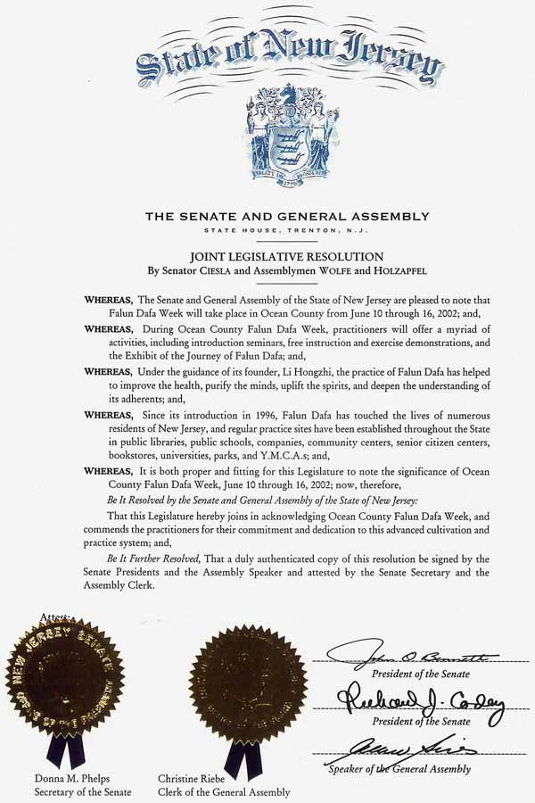 鉴于,自从1996年传入新泽西州以来,法轮大法触及了新泽西州的无数居民,在全州众多的图书馆,学校,公司,社区中心,老年中心,书店,大学,公园和YMCA等处都设有固定的炼功点,并且;