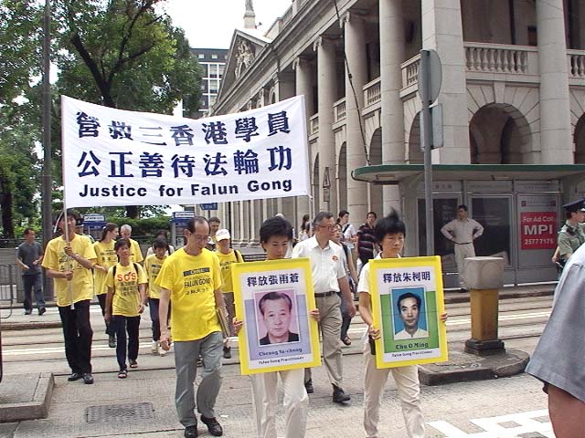 为了开创公正和平利于讲清真相的环境,一百多名学员在请愿行动中每半个小时齐发正念。在发正念的间隙时间,学员和张雨苍的姊姊张妙清分别宣读了给香港政务司司长曾荫权的请愿信。在三时半左右,由十多位法轮功学员和张雨苍的姊姊张妙清组成了步行队伍,拿着写上“营救三香港学员 公正善待法轮功”的横幅以及朱柯明和张雨苍的照片,步行至政府总部递交请愿信。