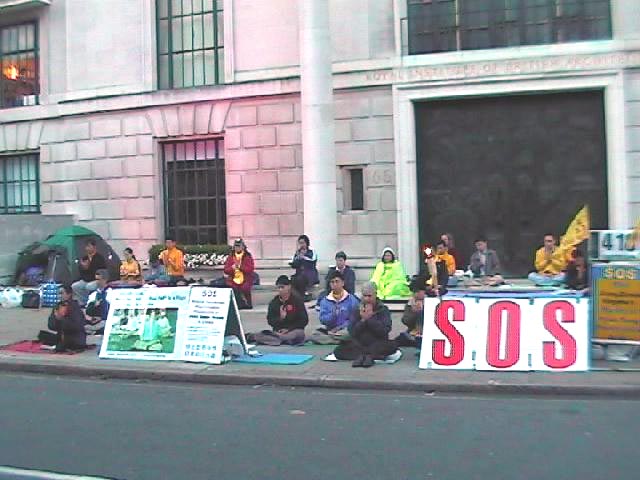 在这新旧宇宙交替之际,在这场正邪决战之时,英国大法弟子在伦敦中使馆前连续整点、半点发正念已进入第二个星期。前来参加活动的有连夜从苏格兰坐火车来的学员,有已连续一个星期食宿在使馆前的弟子,有年迈的老人,还有十几岁的小弟子。在这次连续整点、半点发正念活动刚开始时,伦敦天天下雨,在大法弟子强大的正念之下,天慢慢开始放晴。阴天慢慢开始散开。白天时而太阳高照,时而乌云密布,时而凉风四起。晚上常常风雨交加。无论怎样,英国大法弟子正念坚定,巍然不动,任凭寒风四起,任凭雷雨吹打,弟子们只有最纯净的心态和最坚定的正念。