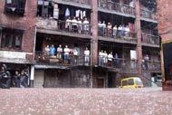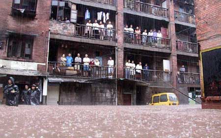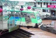 | 半悬于长江上的脱轨缆车 | 居民被洪水困在楼上 |