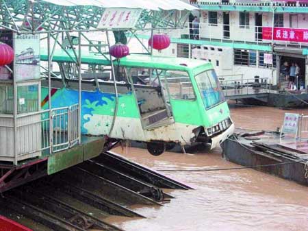 昨天早上,朝天门码头一辆观光缆车因刹车失灵而脱轨,险些冲进长江。据维修人员介绍,出事时观光缆车上只有三名乘客,缆车脱轨后,往长江冲去,半个车身悬在江面上,乘客们在车里大喊大叫,所幸都没有受伤,有惊无险。
