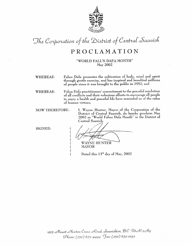 【明慧网2002年6月15日】加拿大不列颠哥伦比亚中塞尼赤(Central Saanich)市褒奖2002年5月为“世界法轮大法月”。
