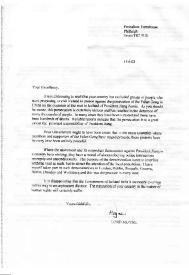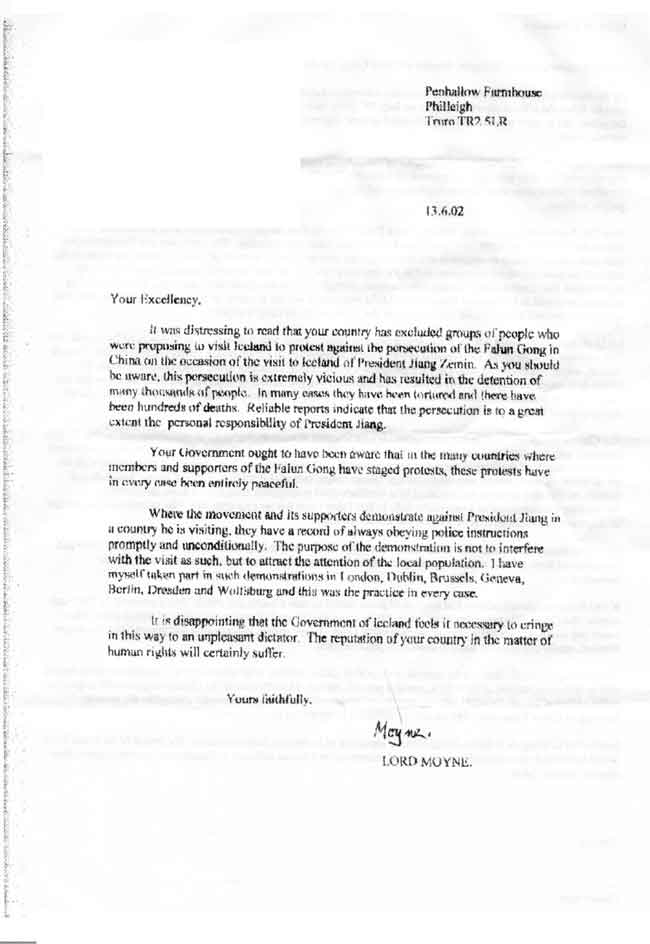 我们痛心地获悉贵国在中国国家主席江XX访问期间,将许多计划前往冰岛抗议[江氏集团]在中国对法轮功的迫害的人士拒之门外。贵国应该意识到,这场迫害邪恶至极,并且已经造成了成千上万人被关押。多数情况下,他们遭受酷刑折磨,数百人被迫害致死。有可靠的报导表明,在很大程度上江XX本人要对这场迫害负责。