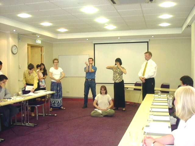 会前,5名分别来自不同国家的大法弟子表演了5套法轮功功法。刚刚赶来的媒体立即抢录和拍摄镜头。