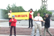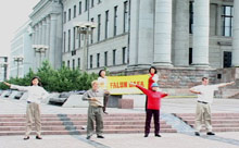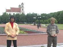六月十四日,来自加拿大、美国、德国、瑞典和澳大利亚的学员在维尔纽斯的立陶宛国会大厦前炼功,并打开了“法轮大法”的横幅。