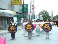 在这场迫害中,中国人民是受害最深的,向中国人民讲清真相是当前最重要的大事之一。本次法会安排了中国城的和平游行,游行的队伍由学员特制的大莲花领头,大约400多名学员,举着横幅,排着整齐的队伍。游行队伍祥和,愉快。学员们唱着法轮大法好的歌曲缓缓走过中国城。路人停下了脚步,静静地观看我们的游行。中国人都很乐意接受大法资料。游行后,学员们分别去了不同的餐馆,继续向世人讲真相。