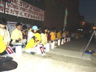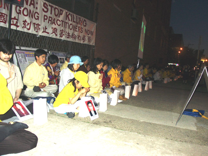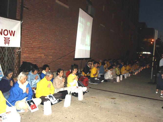 配合全球密集发正念,从下午3点半起,学员们集中于芝加哥中领馆发正念,烛光守夜。同时向路人播放被迫害致死学员的幻灯及法轮功真相电视片。观看的路人很多,就连领馆的人都在看。学员们在11:00 发完正念后才离开。还有几位学员留在领馆继续通宵发正念。