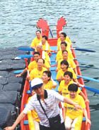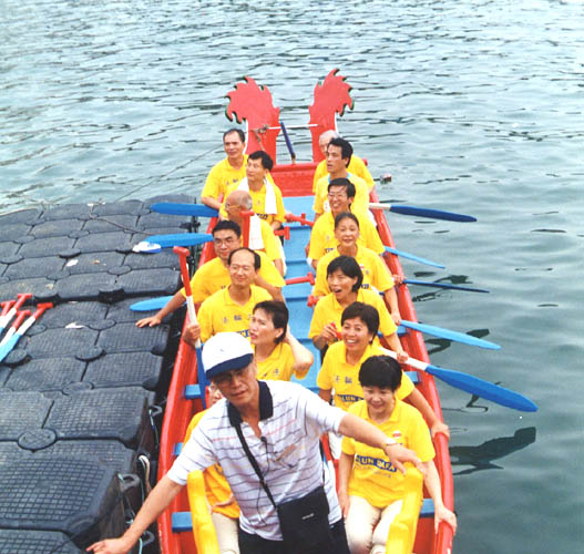 下午一点,16个大法弟子登上龙舟参与友谊赛,一式的黄衣光鲜亮丽吸引了群众的目光,因为所有弟子都是第一次划龙舟,光是将龙舟定位到起跑线,就折腾了半天,更吸引住群众目光落在弟子背上的「法轮大法」及「真善忍」几个字上,也营造了不少欢笑声,洪法效果非常好。有个大法女弟子更了不起,自告奋勇当夺标手,当她趴上龙头探出半个身子悬空夺标时,真正感受到大法弟子没什么做不到的!弟子们为了达到更大的洪法效果,又额外争取到一次比赛机会;虽然两次比赛都输了,但我们本不求世间得失,只求救渡众生。