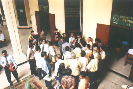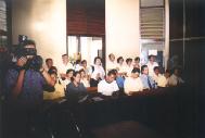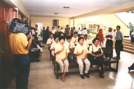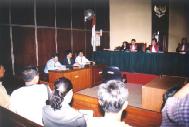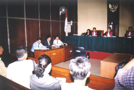 二十多位大法弟子身穿整齐的黄色T恤,很有秩序地安静地出席听审。中午12时30分院长宣布开庭,并宣称;今天按时开庭,主控方面:印尼法轮功佛学会,委任Adi Warman律师提控。被告方面:中国驻印尼大使馆。但是中国大使馆今天没有出席,理由是法轮功没有在中国大使馆里注册登记,所以不出席开庭。