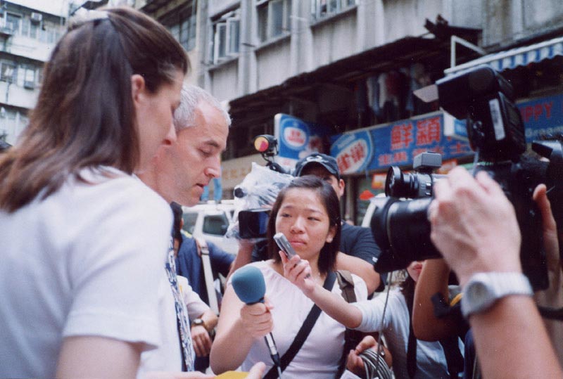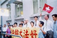 早上,十六名学员穿戴整齐,平静地走进了法院。前来听审的有来自瑞士领事馆的代表、一些本地学员和五位专程从瑞士来到香港的外国学员。今天的记者也是特别的多,因为这次的审讯,除了是一件国际关注的事件之外,也是对香港一国两制的一个重大的考验。十六名学员在进入法院前稍作停留,带着微笑向众多记者展示了写上“法轮大法好”的横幅。