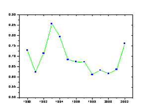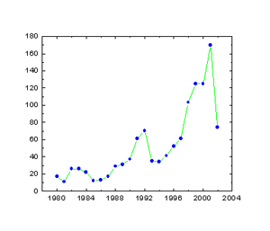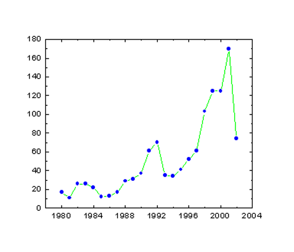 3.图三为自1980年以来历年强于20的爆发次数。从图三中可以看出,1992年总爆发次数达到一高峰,1999年总数又达到新的高峰并在此后维持在这一水平上(2002年的数据偏低是因为目前只有五个多月的数据)。而法轮大法自1992年传出,在1999年开始在中国被镇压直到今天,这仅仅是个巧合么?