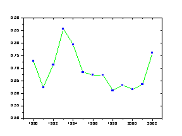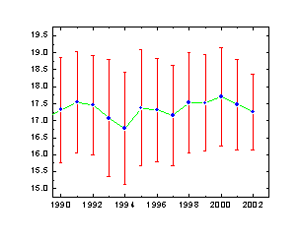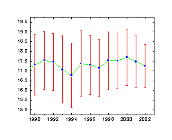 该网址标出了各次爆发的强度。数字越小强度越大。第一个问题是:随着更灵敏的仪器的出现,观测到的事例会越来越多。为消除仪器灵敏度的影响,我们选择了20的强度为标准,这是因为1950年就有了观测这样弱的超新星爆发的技术。同时,我们用以下办法来判断这样选取的数据是否的确消除了仪器灵敏度的影响:更灵敏仪器的出现,必然会使观测到的强爆发比例下降,超新星爆发的平均强度在总体上会减小(强度的平均数值变大)。比如说,开始时只能看到强度18或更强的现象,那么100%的观测都是强于18的。有了可以观测到强度20的仪器后,就会开始看到比18弱的现象,比强度18强的现象比例就会减小,从而使得平均强度减小。也就是说,如果对比20强的超新星的观测结果受仪器灵敏度的影响,那么观测到的比18强的超新星的比例会随着仪器灵敏度的增加而逐年下降,比20强的超新星爆发平均强度也会逐年减小。图一我们画出了近年来所有比20强的爆发中,强于18的百分比。可以看到,1990年后,强爆发的比例有增有降。图二是自1990年以来低于20的超新星爆发的平均强度,可以看出平均强度也是有增有降,变动都在标准误差的范围内。排除了比20强的超新星爆发观测结果受仪器灵敏度影响的可能性。