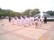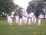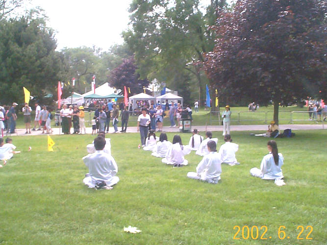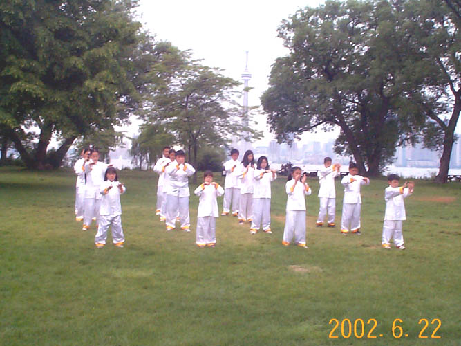 下午一点,龙舟赛开始了,游人们也都上了岛,小弟子们穿上了炼功服,在游人川流不息的公园小道旁开始了功法演示。这时的天空阳光明媚,孩子们的炼功服显得有些厚热,但只见刚才还顽皮天真的孩子们,一个个的表情祥和,动作认真整齐,任凭汗水在脸颊边流淌,却只是一遍又一遍的随着音乐反复炼着功。