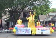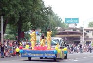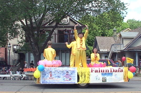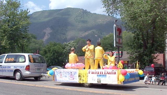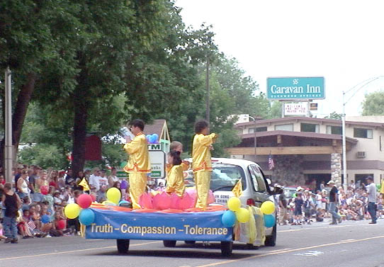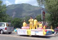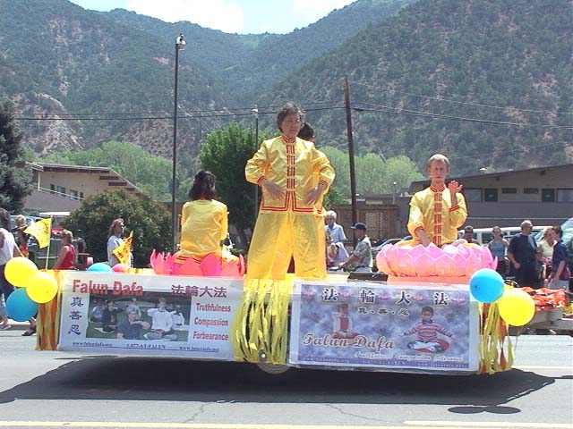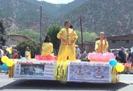 在优美祥和的乐曲中,“法轮大法在科罗拉多”花车缓缓前行,这是本次游行的倒数第二辆车,所以也是“压轴戏”。两个美丽的莲花台上,伴随着普度音乐,四位学员表演着功法,吸引了众多游人的目光。值得一提的是,这两个美丽的莲花台是两位弟子在百忙之中的两天之内手工完成的。身着黄T恤的学员们在游人中穿梭,发着大法资料。