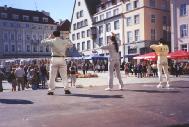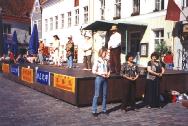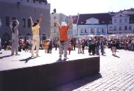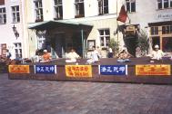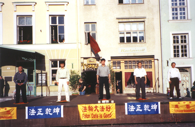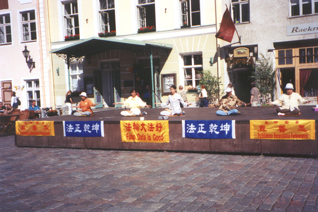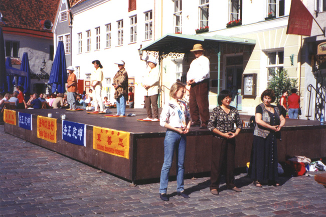 当我们进入到古城的中心广场时,我们惊讶地发现这里人山人海。广场四周是各种餐铺,餐铺外面摆放着大量桌椅,人们密密麻麻地坐在那里喝着啤酒,广场的一面是一个露天市场,有众多的摊位,游客们在那里川流不息(见图)。市场的对面则是一个舞台,舞台前面竟然挂着各种鲜艳颜色的法轮大法横幅。定神一看,原来一组澳大利亚学员和多伦多学员已经在台上进行功法演示了。真是洪法佳机!得来全不费功夫(后来从网上得知澳大利亚学员为拿到这个舞台而曾与经理商谈)。于是,我们立刻上台进行新一轮的功法演示(见图),先是年轻学员、然后是老年学员、接着是女学员、然后是男学员;动功、抱轮、打坐一遍遍做着,吸引了无数目光。台下的学员抓紧时机,向人们递交资料,有英文的,俄文的,还有爱沙尼亚文的。人们主动与我们交谈,还有的人当场要求学功(见图)。一位爱沙尼亚小伙子腼腆地走上前来用有限的英文不断重复地说:“我非常喜欢这个音乐。”并问爱沙尼亚是否有学员。他手里已经拿着一份大法传单。