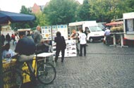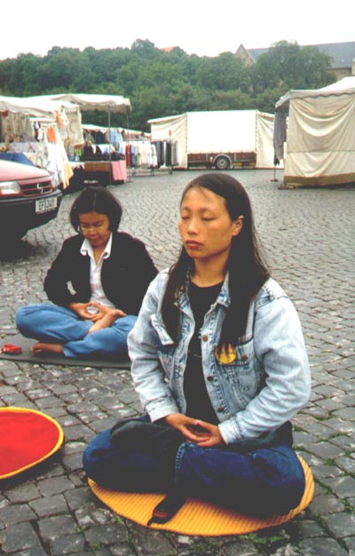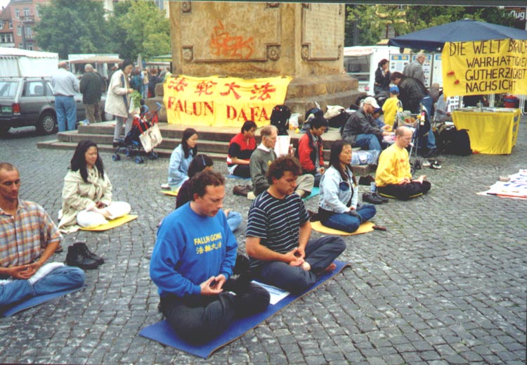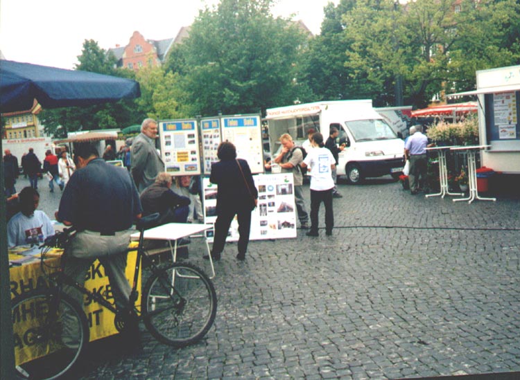 许多人认为我的建议很好,并给予支持,而且很乐意参加。我们租了一辆汽车,做了一条写有“世界需要真、善、忍” 的大横幅。从其它城市也来了很多同修。我们得到的场地即是去年七月我们举行过一次活动的地方,在Erfurt大教堂前的方尖塔旁边。当警察从这里经过并问我们为什么要举办信息活动时,我讲述了法轮功、其原理及发生在中国的这场迫害。