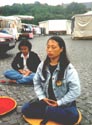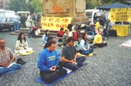 人们停在我们的SOS横幅前,静静地观看和谐的功法,我想,他们一定能感受到我们的宁静──这是我们通过对真、善、忍的理解所得到的。