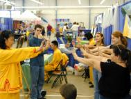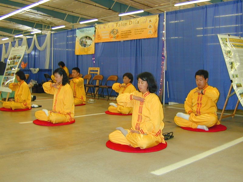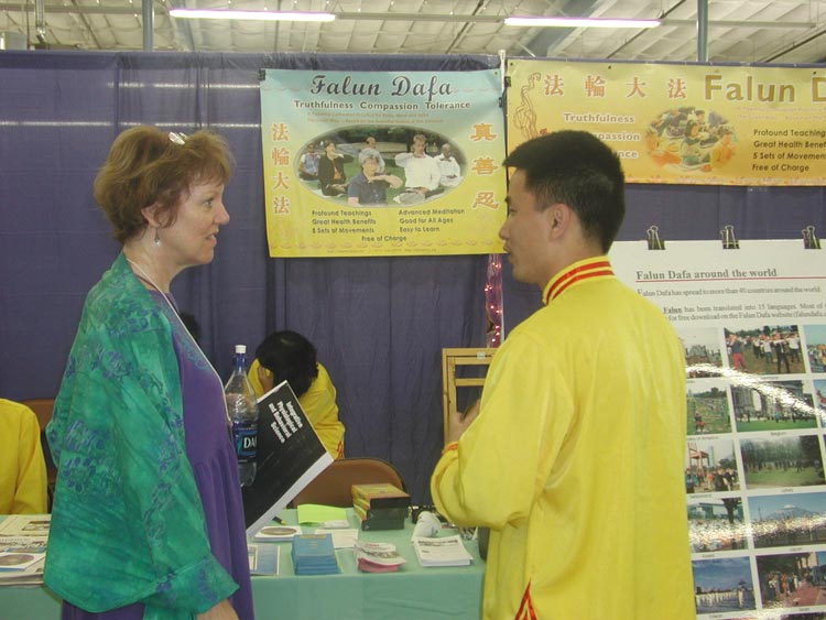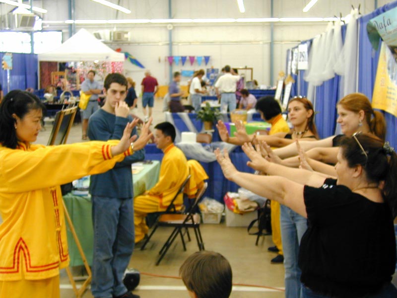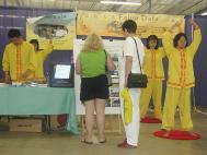 在两天的活动中,学员们身着亮丽的黄色炼功服,轮流进行了五套功法演示。学员们宁静而祥和的炼功场面吸引了不少参观者驻足观看,还有人马上就要求学炼五套功法。不少人主动过来索要资料,并购买了教功录像带。同时学员们还以电视的方式播放了英文的法轮功真实故事的录像带,并向参展的其他展位赠送法轮大法光盘。