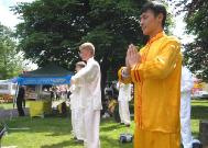 学员们不停地在展台附近演示功法。星期天,学员们还身穿传统炼功服在公园节中心舞台上向观众展示功法。一些少年随后来到大法展台前认真地学习功法。展台旁边,一位大法弟子用毛笔书写中文名字吸引了大批游人,使游人在得知大法的同时又欣赏了中华艺术。