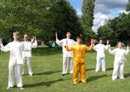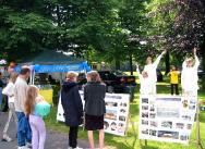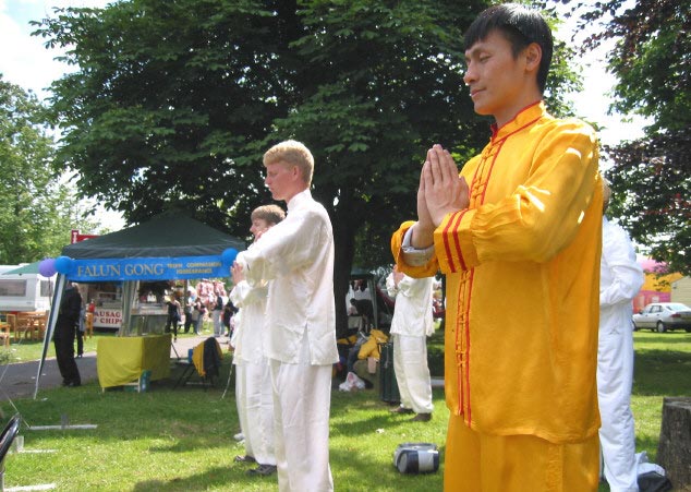 【明慧网2002年6月27日】6月22、23日两天,英国中西部的一些大法弟子来到曼彻斯特市参加维森寿公园节。在搭起的展台上放着大法资料和传单供游人索取,几张法轮功真相图片也摆在路旁。络绎不绝的游人每每被展示的法轮功真相介绍和舒缓优美的功法表演所吸引而驻足。大法弟子忙不迭地分发大法传单并向很多善良的当地居民介绍法轮功功法及其在中国遭到的残酷迫害