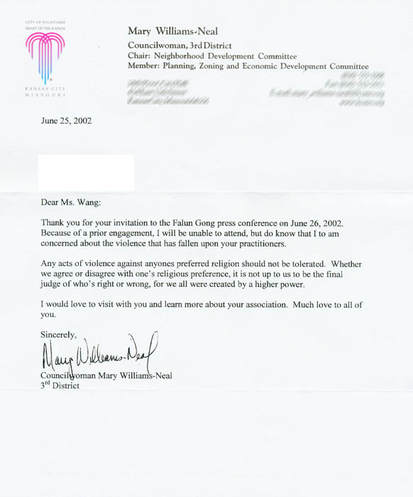 感谢你邀请我参加2002年6月26日的法轮功新闻发布会。因有已经预订好的其它安排,我无法出席,但我很关注法轮功学员所遭受的暴力。