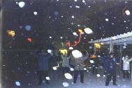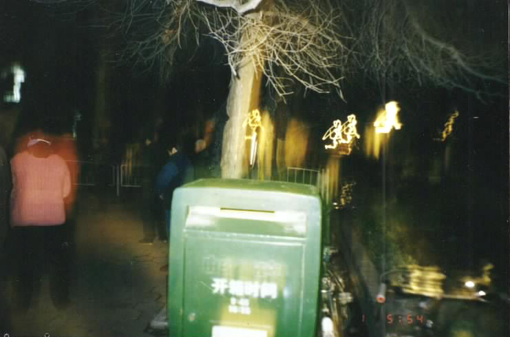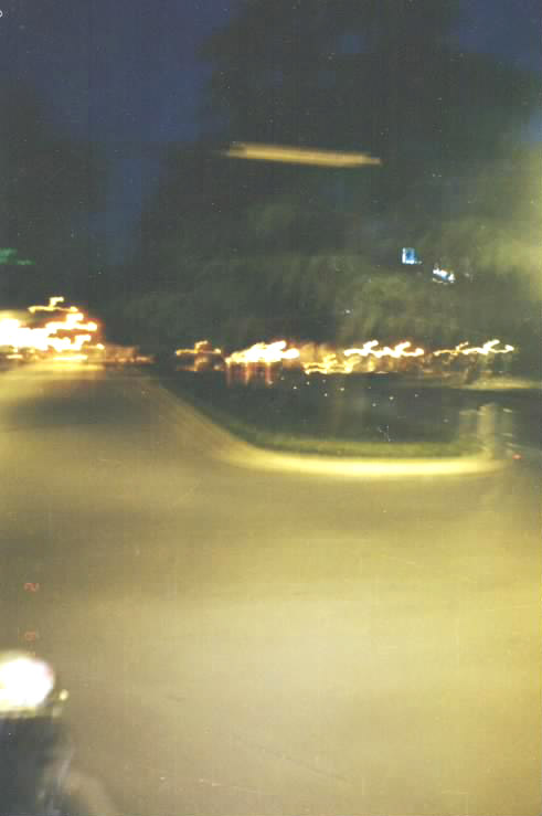 2、南京市政府门前炼功点晨炼(1999年3月1日5点53分)。(第一张照片上显示每个打坐的法轮功学员头顶出现的光环及炼功场上空的大光带;第二张照片上有四个类似天使的光影)