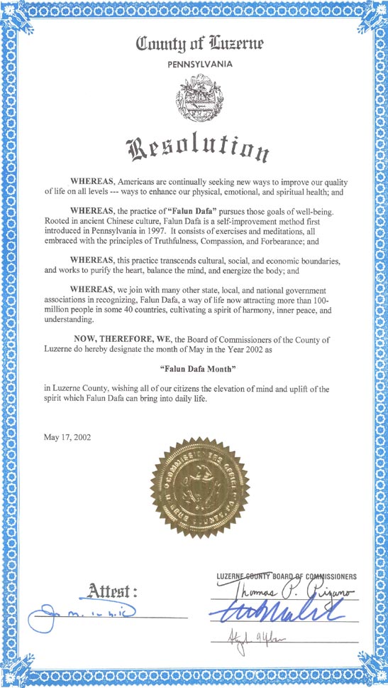 鉴于,法轮大法追求以上这些美好目标。法轮大法来源于古老的中国文化,是一种自修方法,于1997年首次传入宾夕法尼亚州。他包括动功和打坐,一切活动都遵从真、善、忍的法理;并且