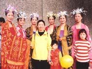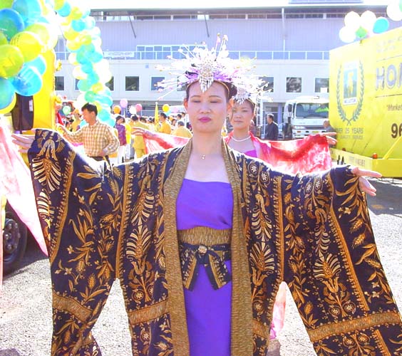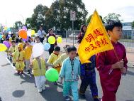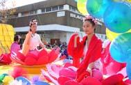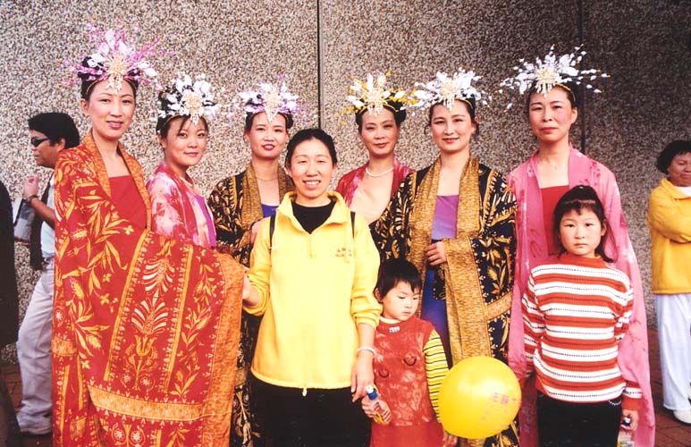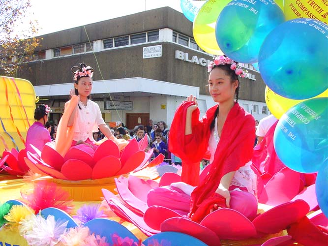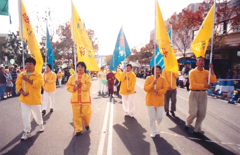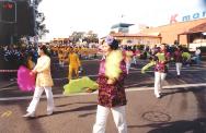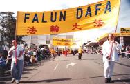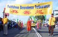 上午11点钟,庆祝游行开始,在众多的社团游行队伍中,300多名大法弟子组成的队伍更是显得阵容庞大。队伍最前面是巨型黄底红字中英文“法轮大法”、“真善忍”横幅,接下来是象征着中国大唐鼎盛时期,歌舞升平,美女长袖善舞风貌的唐装服饰表演,大法弟子身着独具风韵的唐装,更是显得天生丽质,楚楚动人。所到之处,市民们为之眼前一亮,赞叹不已。随后是五彩缤纷美丽的大花车,两束硕大的印有“法轮大法”、“真善忍”的彩色汽球束飞舞在花车上空,车上5位大法弟子盘坐在五朵大莲花上,在优美动听的炼功音乐声中,向人们展示着第五套功法。8面迎风招展的“法轮大法”、“真善忍”彩旗后面,是令人耳目一新的秧歌队,大法弟子喜气洋洋,载歌载舞。最后面是身着黄色上衣、手拿“真善忍”彩色汽球的大法弟子队伍,大家边走边唱“法轮大法好”。