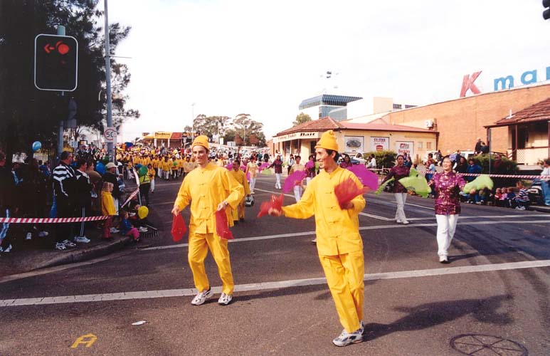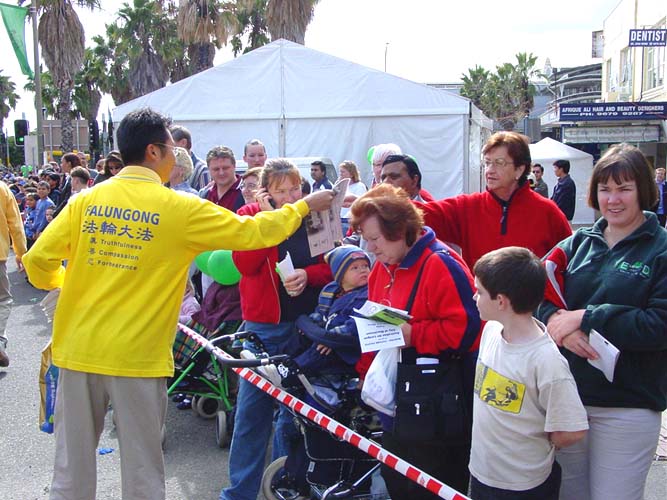 【明慧网2002年6月4日】6月1日(星期六),是黑镇(Blacktown)的市庆节,它是西悉尼最大的一个社区节日。虽然清晨5点钟至6点多钟,下了足足一个多小时的大暴雨,但还是没有将人们拦住,仍有数万人从四面八方,甚至更远的市区涌向这里,来欢庆该市已有27年历史的每年一度的传统节日。悉尼地区大法弟子抓住这个机会洪法和讲清真相