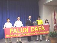 随后在大厅的主席台上市长爱德华.哥尔查和学员们一起拉“法轮大法”“真、善、忍”横幅并手举褒奖书合影。这是爱德华.哥尔查先生第二次褒奖法轮大法。圣安东尼奥市前任市长豪沃德.丕克先生也曾两次褒奖法轮大法。